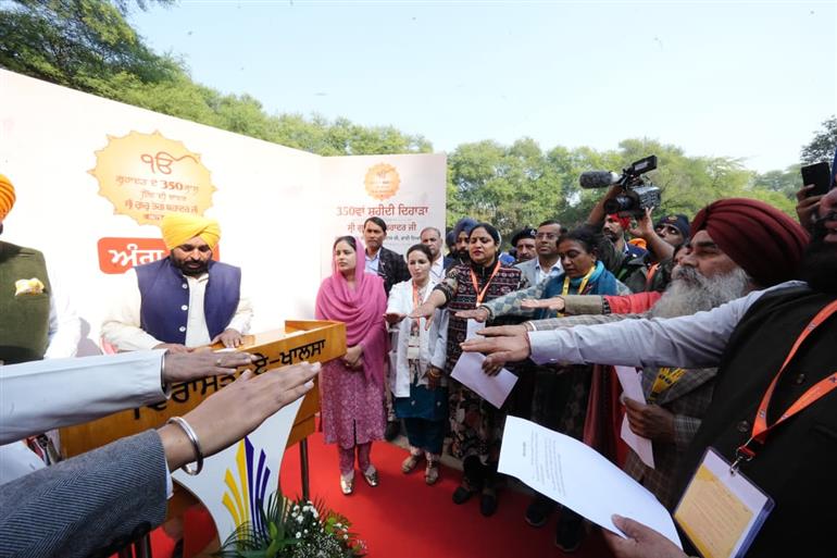 ਸ੍ਰੀ ਅਨੰਦਪੁਰ ਸਾਹਿਬ : ਮੁੱਖ ਮੰਤਰੀ ਭਗਵੰਤ ਸਿੰਘ ਮਾਨ ਦੀ ਅਗਵਾਈ ਵਾਲੀ ਪੰਜਾਬ ਸਰਕਾਰ ਵੱਲੋਂ ਨੌਵੇਂ ਸਿੱਖ ਗੁਰੂ ਸਾਹਿਬ ਸ੍ਰੀ ਗੁਰੂ ਤੇਗ਼ ਬਹਾਦਰ ਸਾਹਿਬ ਜੀ ਦੇ 350ਵੇਂ ਸ਼ਹੀਦੀ ਦਿਹਾੜੇ ਨੂੰ ਸਮਰਪਿਤ ਇੱਕ ਵਿਸ਼ਾਲ "ਸਰਬੱਤ ਦਾ ਭਲਾ ਇਕੱਤਰਤਾ" ਸਮਾਗਮ ਕਰਵਾਇਆ ਗਿਆ। ਇਸ ਦੌਰਾਨ ਸੀਨੀਅਰ ਆਗੂਆਂ ਨੇ ਸੰਗਤ ਨੂੰ ਸੰਬੋਧਨ ਕਰਦਿਆਂ ਗੁਰੂ ਸਾਹਿਬ ਜੀ ਦੀ ਲਾਸਾਨੀ ਸ਼ਹਾਦਤ ਨੂੰ ਸ਼ਰਧਾਂਜਲੀ ਭੇਟ ਕੀਤੀ ਅਤੇ ਇਸ ਇਤਿਹਾਸਕ ਸਮਾਗਮ ਨੂੰ ਕਰਵਾਉਣ ਸਬੰਧੀ ਸਰਕਾਰ ਦੇ ਯਤਨਾਂ 'ਤੇ ਚਾਨਣਾ ਪਾਇਆ।