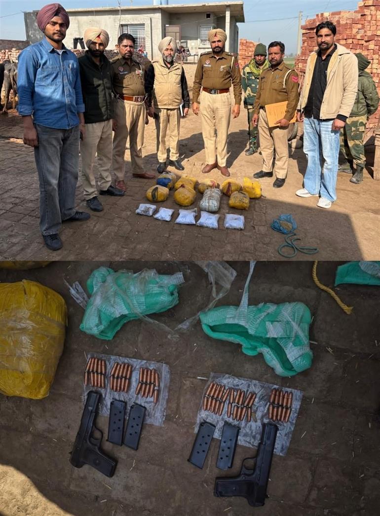 ਅੰਮ੍ਰਿਤਸਰ (ਜਗਤਾਰ ਸਿੰਘ ਮਾਹਲਾ)ਅੰਮ੍ਰਿਤਸਰ ਦਿਹਾਤੀ ਪੁਲਿਸ ਥਾਣਾ ਭਿੰਡੀਸੈਦਾਂ ਅਧੀਨ ਪਿੰਡ ਘੋਗਾ ਵਿਖੇ ਬੀ.ਐਸ.ਐਫ ਨਾਲ ਇੱਕ ਸਾਂਝੇ ਆਪ੍ਰੇਸ਼ਨ ਵਿੱਚ ਸਰਹੱਦ ਪਾਰੋਂ ਨਸ਼ੀਲੇ ਪਦਾਰਥਾਂ ਅਤੇ ਹਥਿਆਰਾਂ ਦੀ ਤਸਕਰੀ ਵਿਰੁੱਧ ਇੱਕ ਵੱਡੀ ਸਫਲਤਾ ਹਾਸਲ ਕਰਦਿਆਂ 25 ਕਿਲੋ ਹੈਰੋਇਨ ਜਿਸ ਦੀ ਅੰਤਰਰਾਸ਼ਟਰੀ ਕੀਮਤ 125 ਕਰੋੜ 2 ਪਿਸਤੌਲ ਅਤੇ 60 ਜ਼ਿੰਦਾ ਕਾਰਤੂਸ ਬਰਾਮਦ ਅਤੇ ਦੋ ਵਿਅਕਤੀਆਂ ਨੂੰ ਗ੍ਰਿਫਤਾਰ ਕੀਤਾ ਗਿਆ।ਇਹ ਬਰਾਮਦਗੀ ਡਰੋਨ ਦੀ ਵਰਤੋਂ ਕਰਕੇ ਇੱਕ ਸੰਗਠਿਤ ਸਰਹੱਦ ਪਾਰ ਤਸਕਰੀ ਮਾਡਿਊਲ ਵੱਲ ਇਸ਼ਾਰਾ ਕਰਦੀ ਹੈ।ਅਗਲੇ ਅਤੇ ਪਿਛਲੇ ਸਬੰਧਾਂ ਦਾ ਪਤਾ ਲਗਾਉਣ ਲਈ ਜਾਂਚ ਜਾਰੀ ਹੈ।
